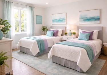 A thoughtfully arranged shared bedroom designed to provide comfort, privacy boundaries and stability while encouraging community living and accountability.